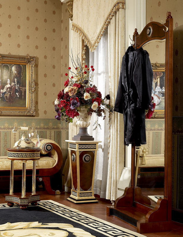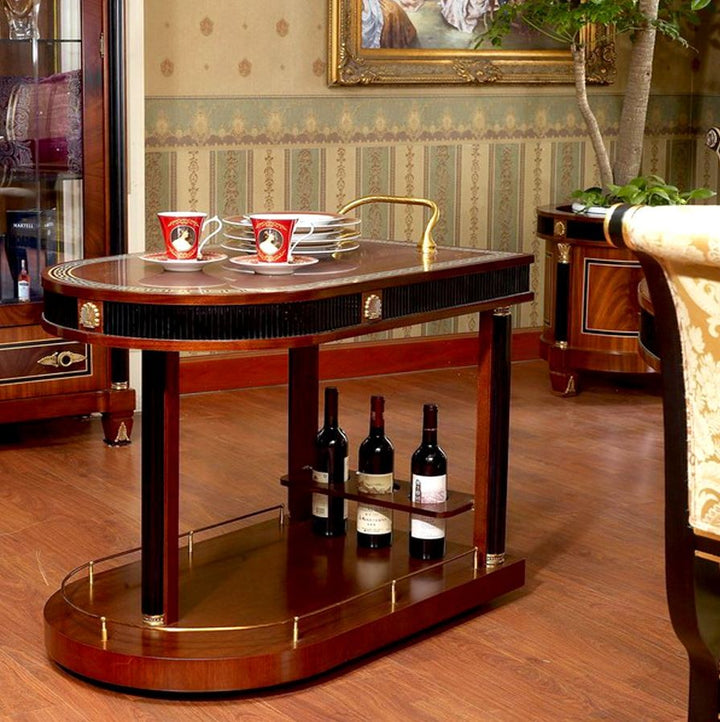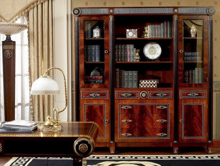 The exclusive Piemont furniture series also includes a complete bar area. Solid walnut combined with black contrasting borders and meander design, refined with bronze applications. This area of your living space will always leave a luxurious overall impression. The bar stools are available in various fabrics or leather colors. Dining rooms, bedrooms, work rooms and sofa sets are also available from this series.