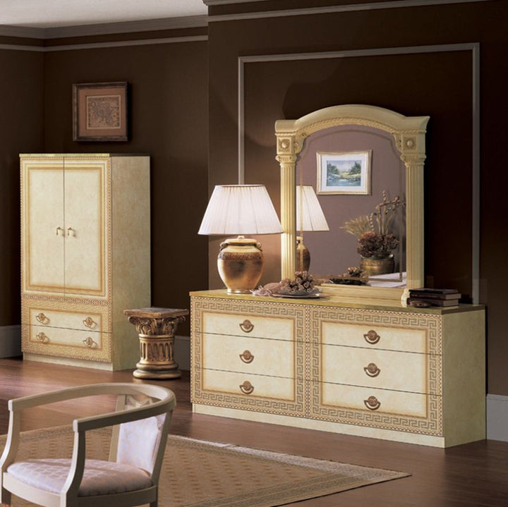 Bedroom set complete, Double bed - 160x200 cm, Double bed - 200x200 cm, Wardrobe 4 doors with 2 mirrored doors, Wardrobe 2 doors, Chest of drawers with 6 drawers, Chest of drawers with 3 drawers, Dressing table, Mirror for dresser, Bedside table with 2 drawers, Upholstered chair with armrest, Slatted frame 160x200 cm, Slatted frame 180x200 cm, Slatted frame 200x200 cm |