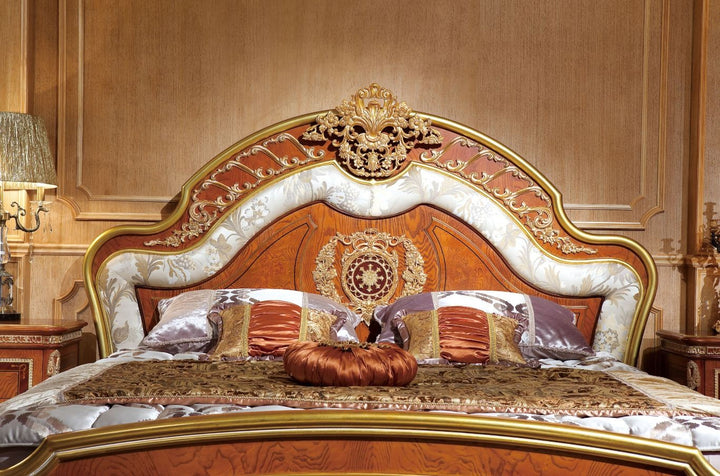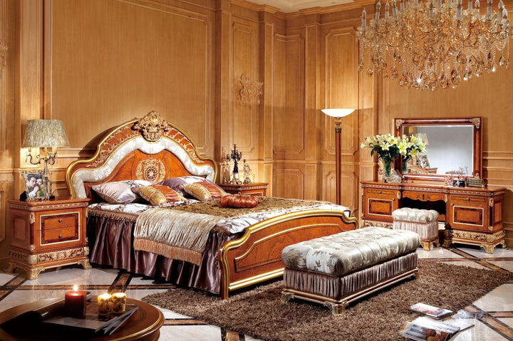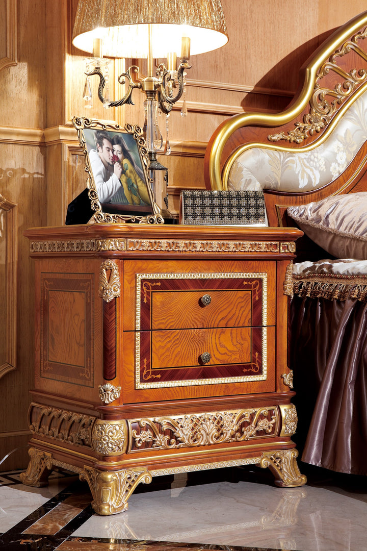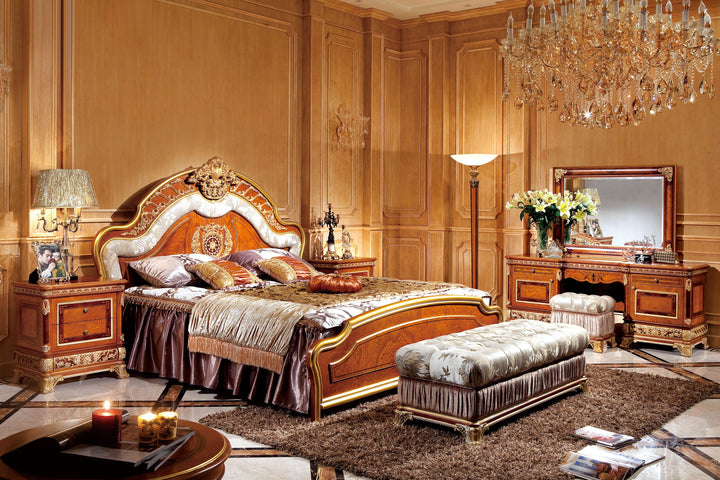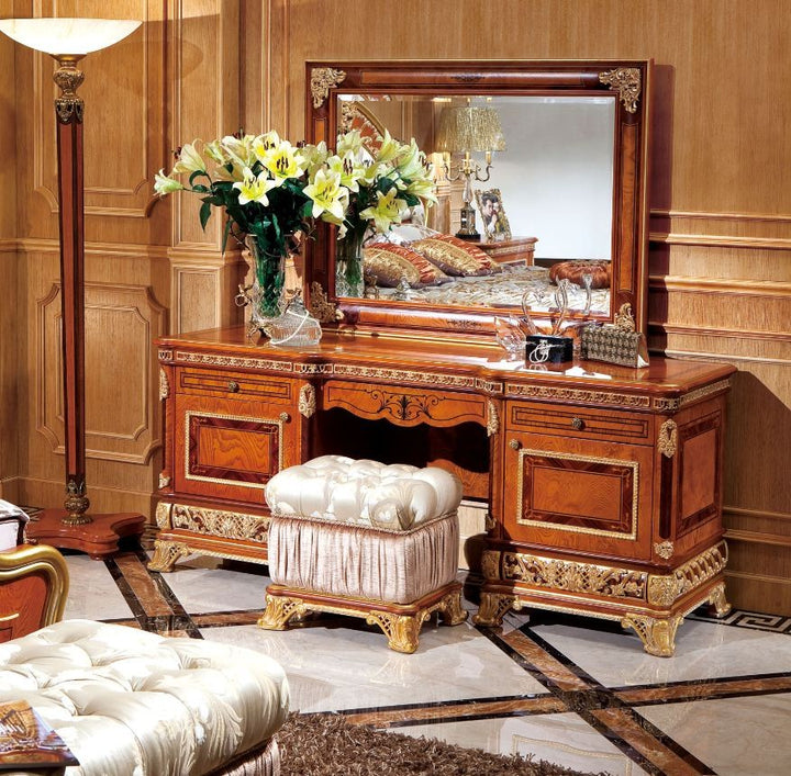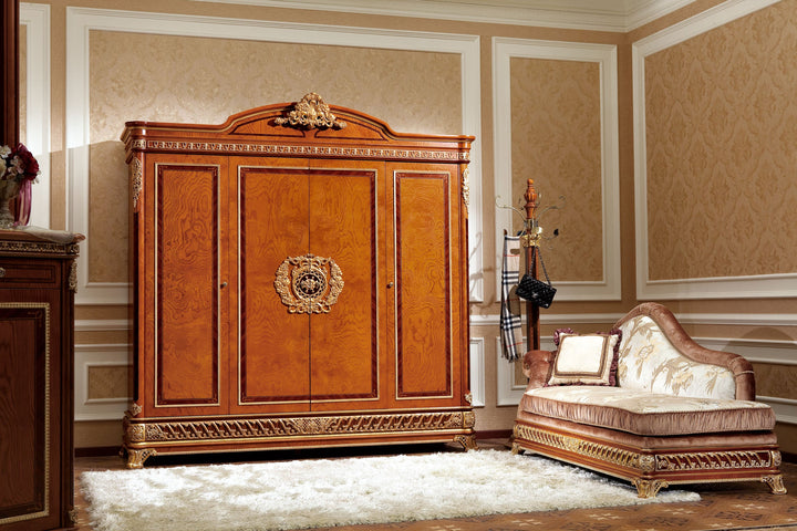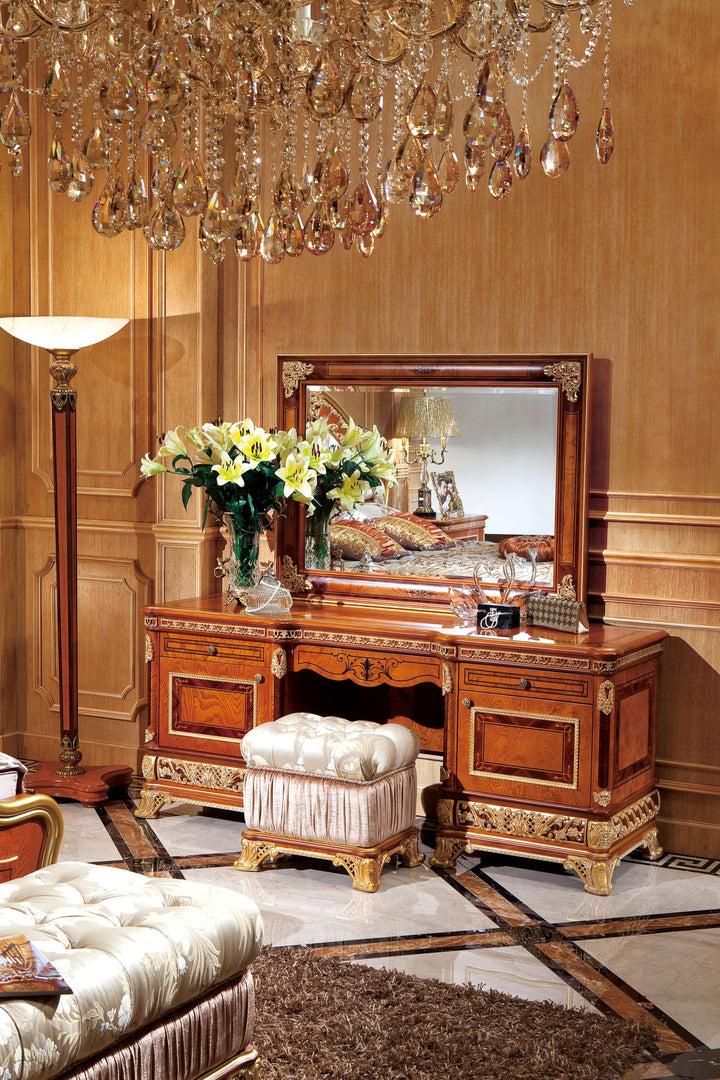 This furniture is an eye-catcher for every room. The furniture is characterized by lightness and timeless elegance. This classic furniture radiates elegance and fascination. The gold leaf decoration is applied exclusively by hand. The series is available in the colors light walnut and cream-white-gold. Benefit from the permanent exhibition offers at particularly reasonable prices. Contact us and let us make you a non-binding offer. Exclusive living at affordable prices through in-house production.