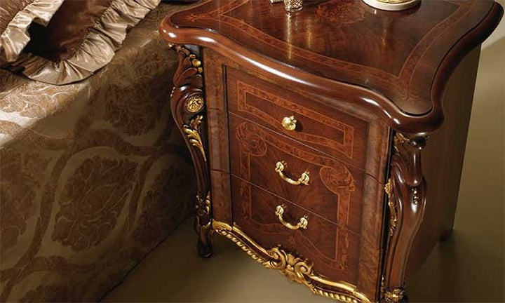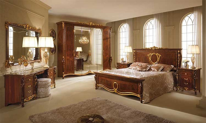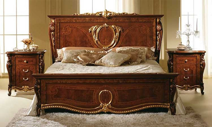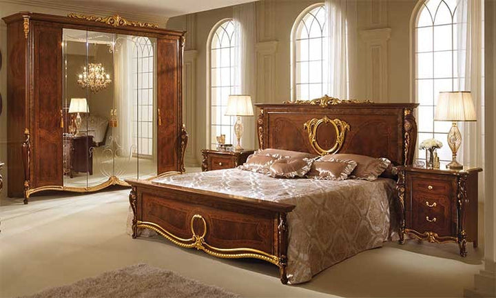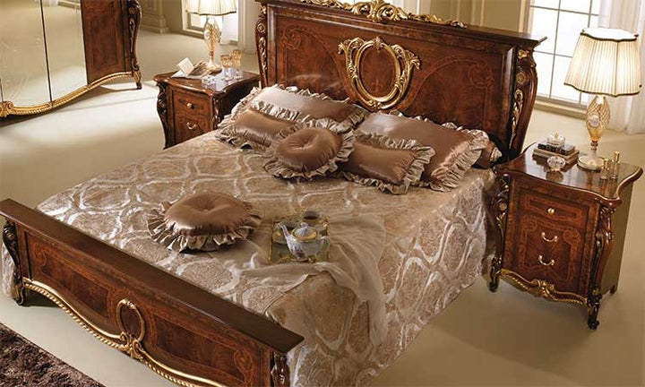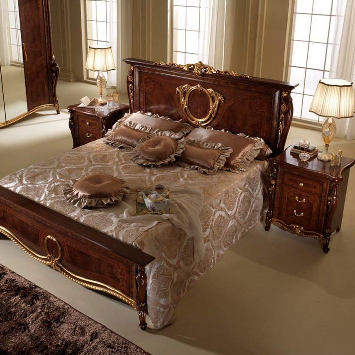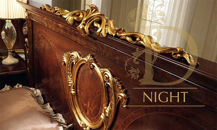 The Donatello bedroom impresses with its finely crafted frames, which together with ornate carvings and ornaments emphasize the elegant matte walnut surfaces.