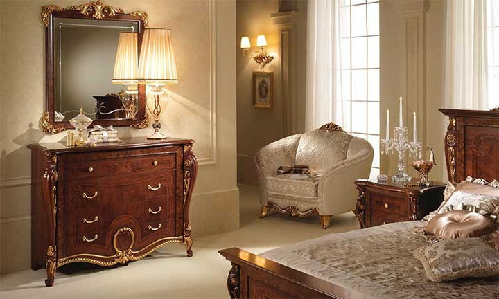 Double bed - 160x200 cm, Double bed - 180/200 x 200 cm, Bedside table with 3 drawers, Chest of drawers with 5 drawers, Mirror for dresser, Mirror dressing table, Stool, Bench Mod Venere, Bench Mod Vittoria |