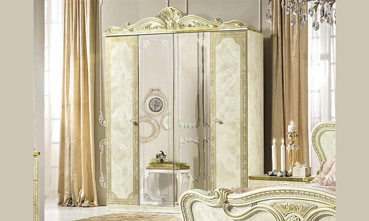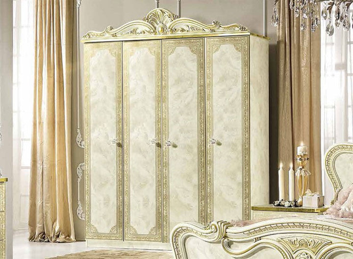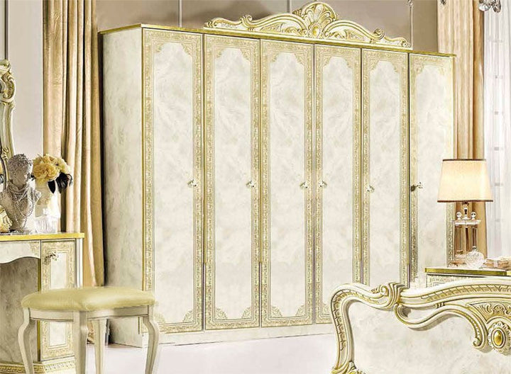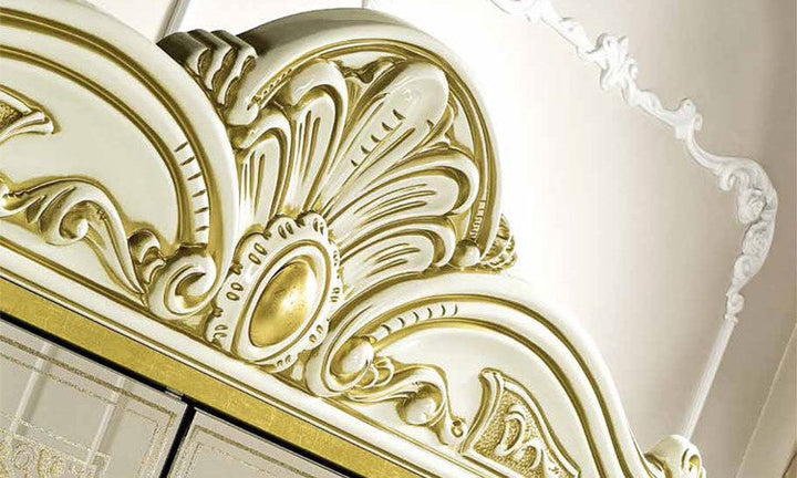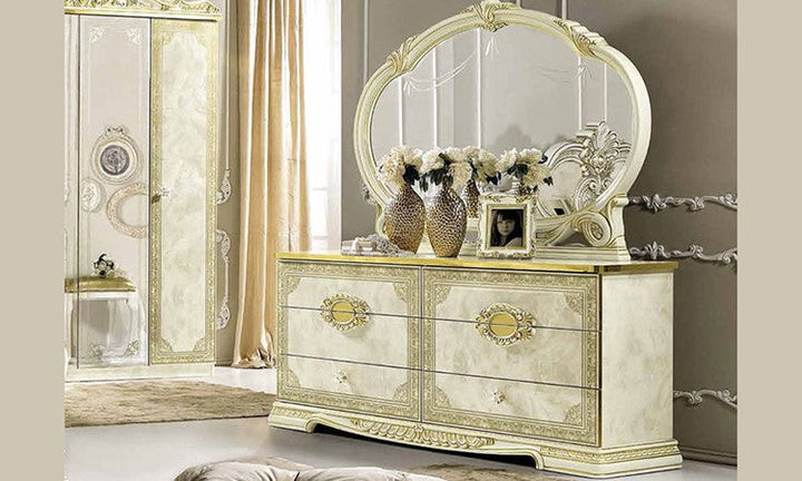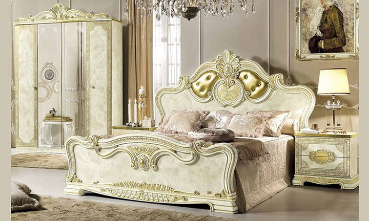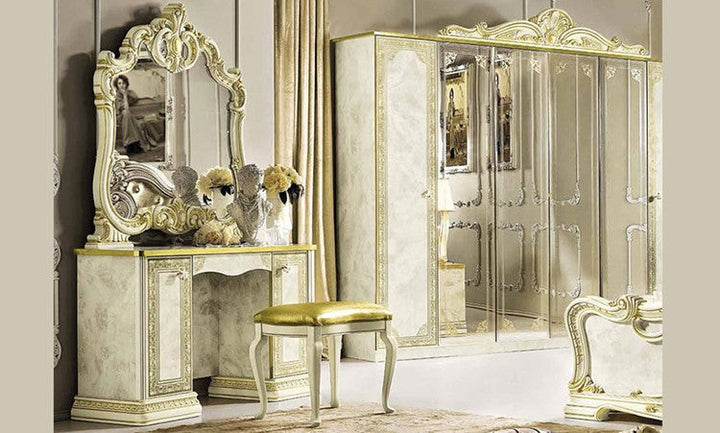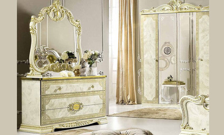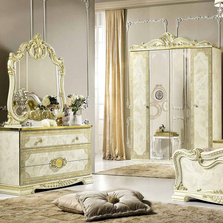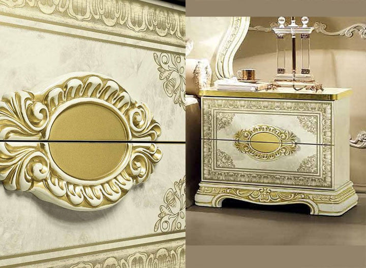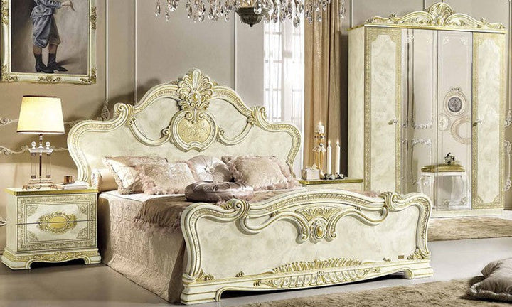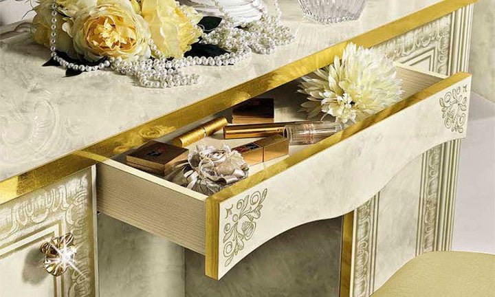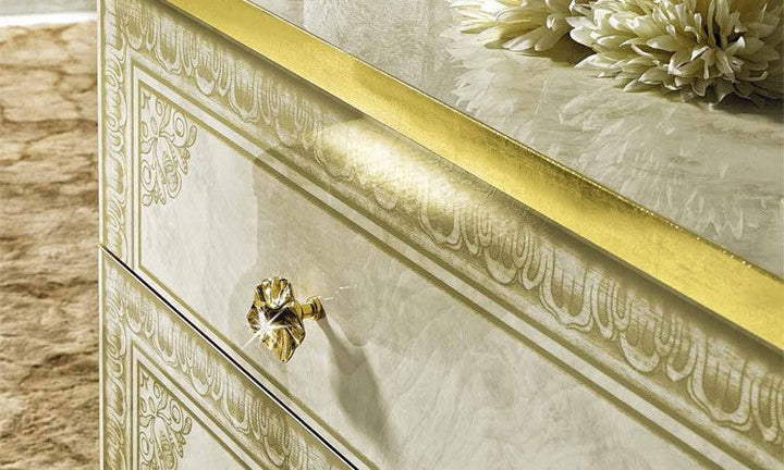 Make your dream of Italian elegance come true, the high-gloss look with a robust acrylic coating ensures that this beautiful series can be used for a long time. Italian production ensures quality and durability. Various items from this series are available and there are no long waiting times. Please contact our staff and let them make you an individual offer. Benefit from our large stocks at a special price. Color: beige high gloss with gold decor, the decorations, mattresses and bed frames shown are not included in the offer.