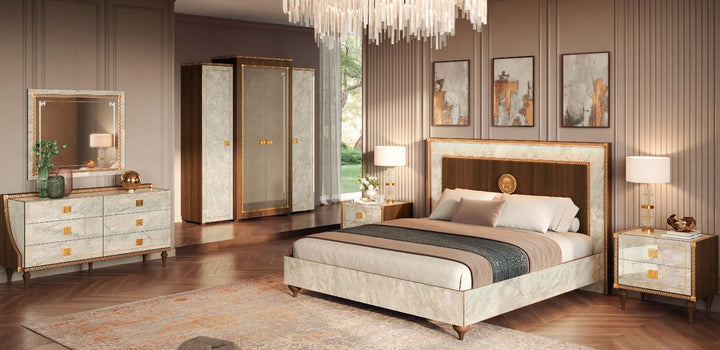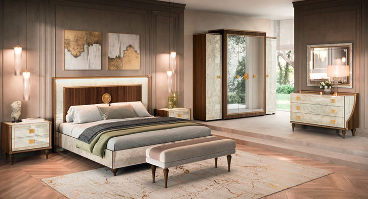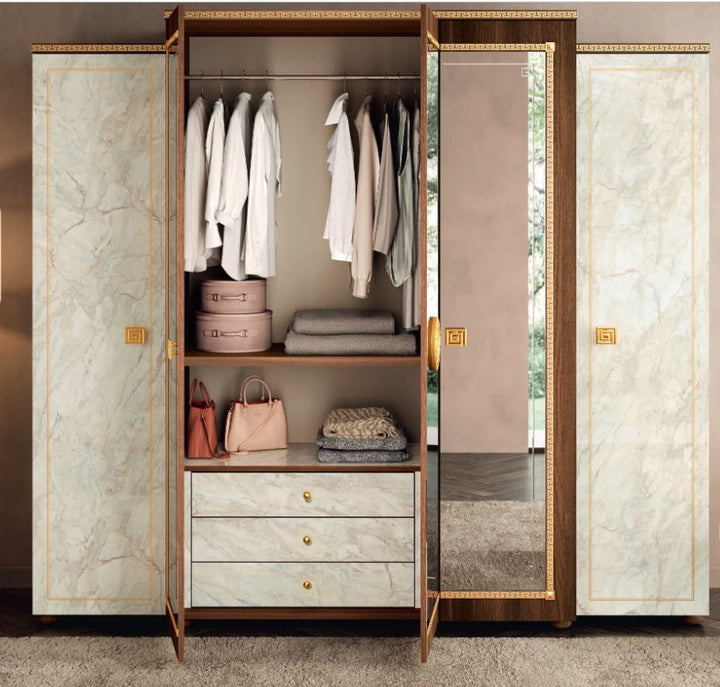The combination of walnut wood panels and Carrara marble effect gives each piece a timeless charm. The color combination is further enhanced by golden neoclassical accents.