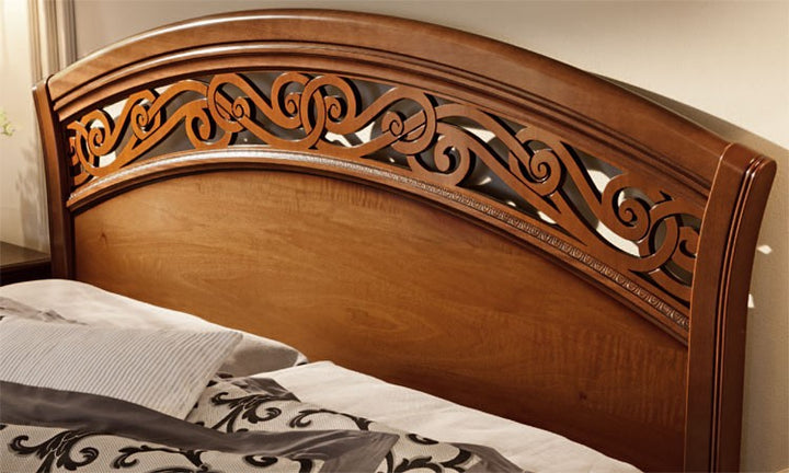The attention to detail is evident in the carefully designed elements such as the surrounding frames made of Toulipier wood on the dresser tops and the hand-crafted arabesque details on the perforated headboard, which underline the high level of craftsmanship and the pursuit of perfection.