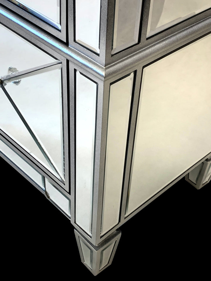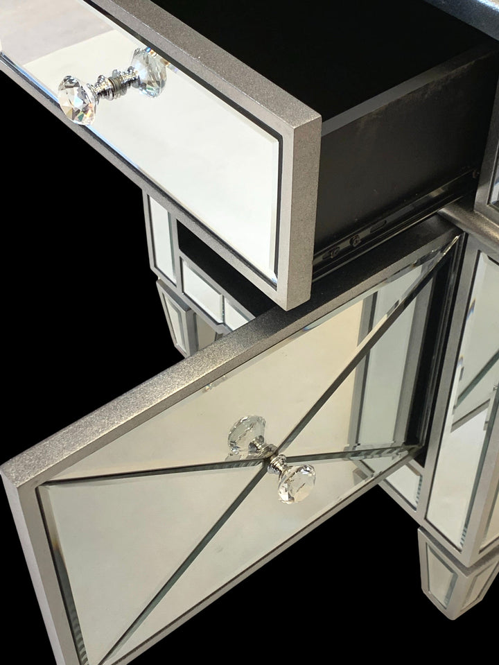 The luxurious bedside table in a pompous and timeless vintage style with a glamour factor will be a stylish accent in your home. The piece of furniture combines elegance and functionality. Thanks to the mirror coating, every room appears larger. The delicate tint of the mirror coating creates a warm appearance. An elegant storage solution with a wow effect! Mirrored furniture creates a magical atmosphere by reflecting sophisticated light.