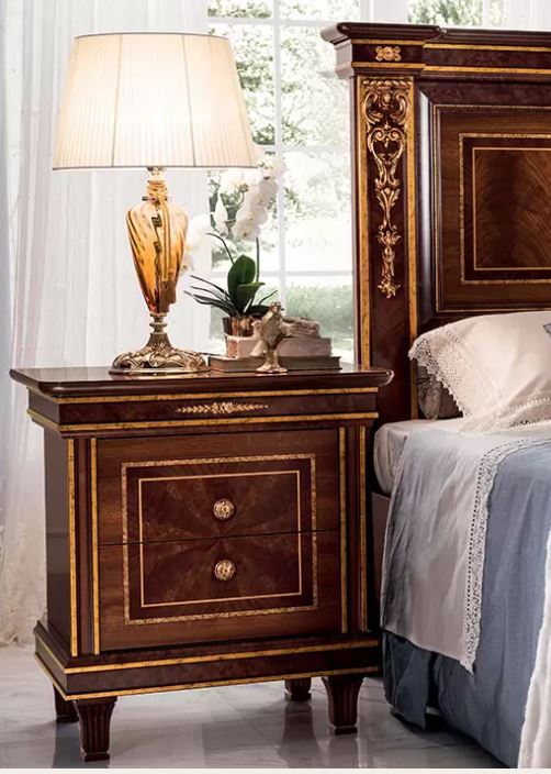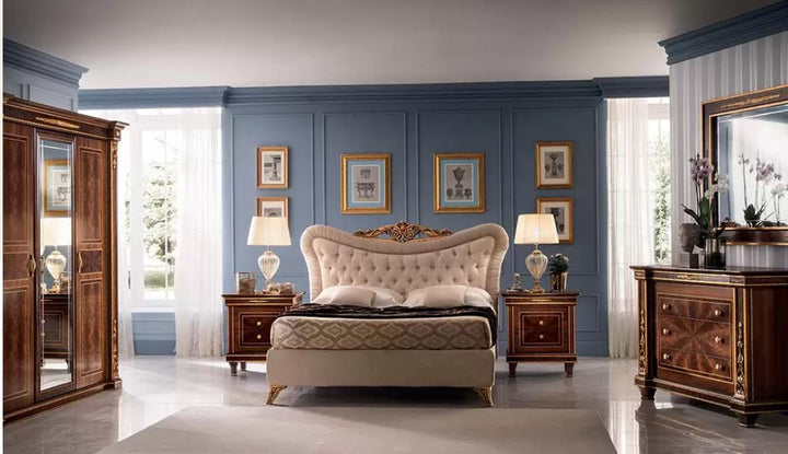 Double bed 1 - 160x200 cm, Double bed 2 160x200 cm, Double bed 2 180/200x 200 cm, Bedside table with 2 drawers, Mirror for dresser, Mirror dressing table, Mirror gold frame small, Mirror gold frame large, Wardrobe 4 doors, Wardrobe 3 doors, Stool, Armchair, Bank Vittoria, Dressing table, Bank Venere |