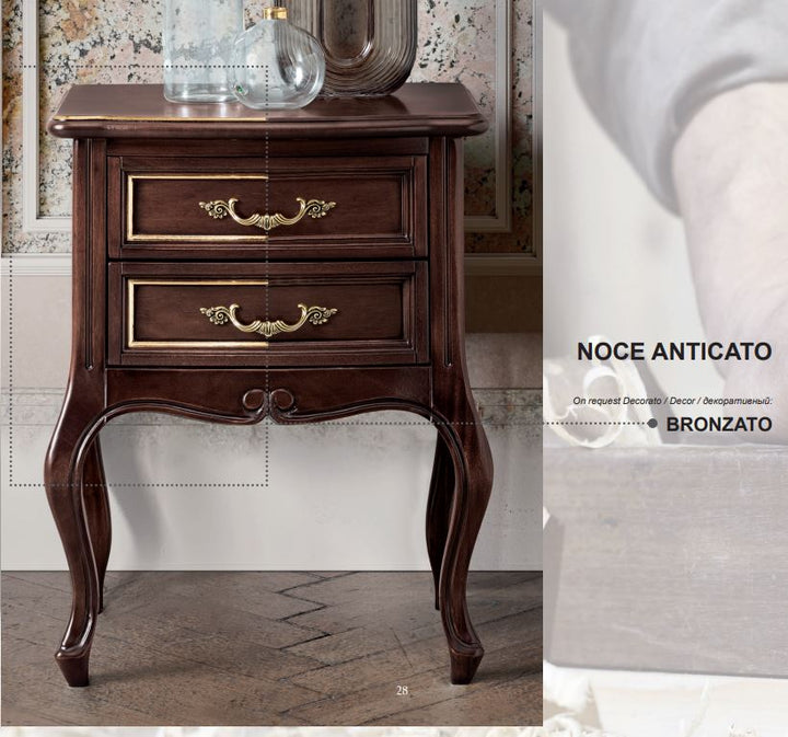 The standard color is antique walnut patinated. The furniture parts can also be ordered with a fine gold/bronze decor and a surcharge of 30% on request.
