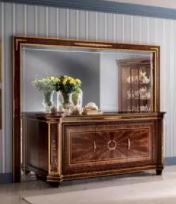 The table is available in two sizes, while the sideboard with fine inlays is given an even more spectacular value by the majestic engraved mirror.