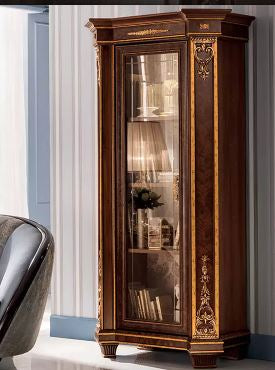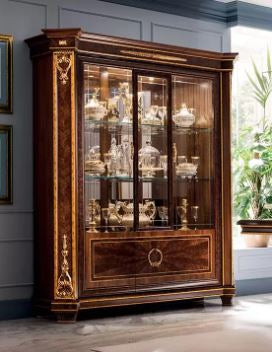 The display cases are reinforced by impressive side columns and inserts made of mahogany feathers and decorated at the ends with hand-crafted gold leaf friezes.