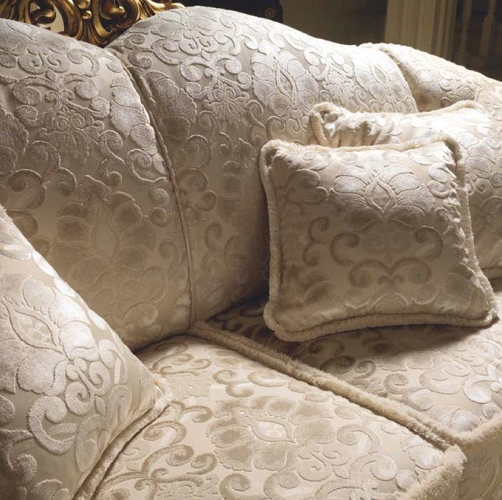 The " Donatello " living room can be customized from a wide selection of high-quality textiles: from fine fabrics such as velvet and damask to printed fabrics, gold or leather in every color imaginable.