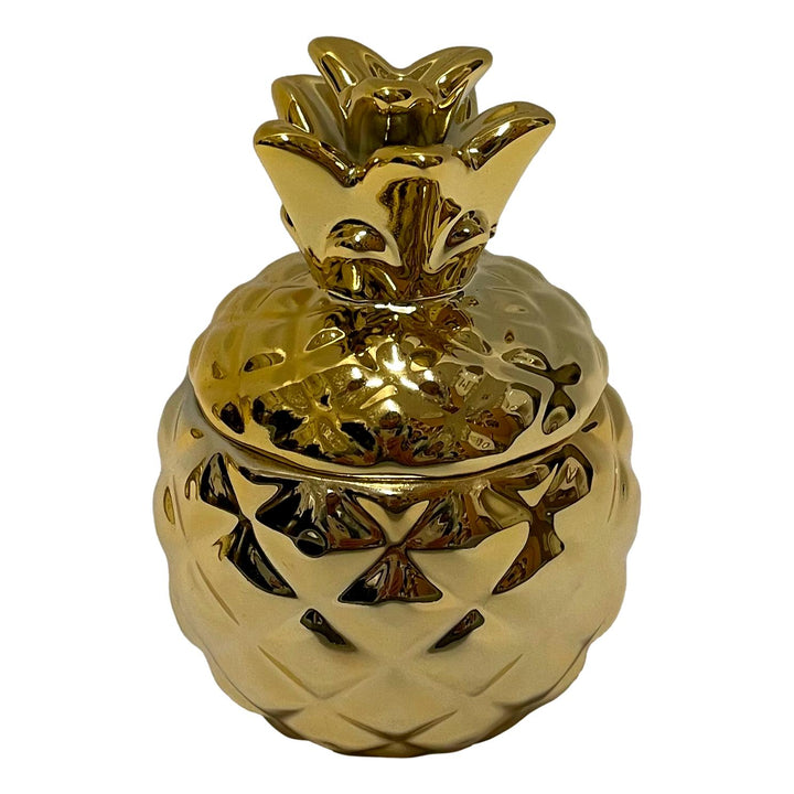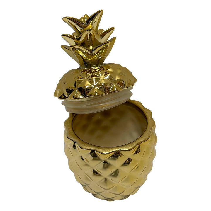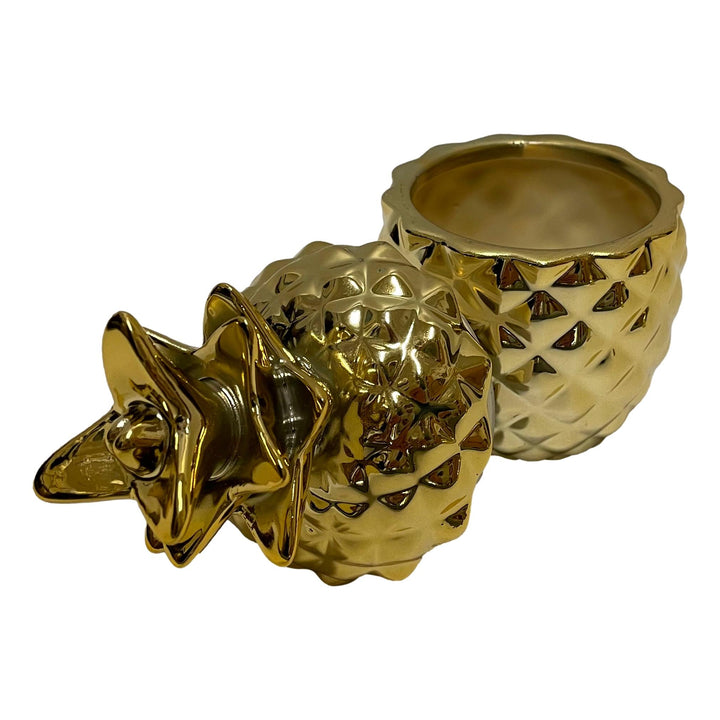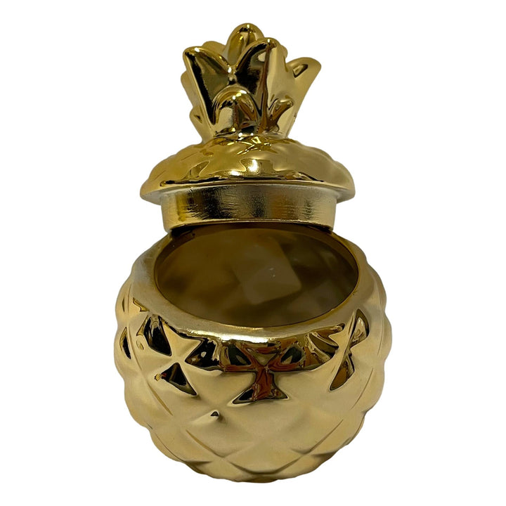The golden pineapple can be opened to store small items such as nuts or to put a candle/tea light inside.