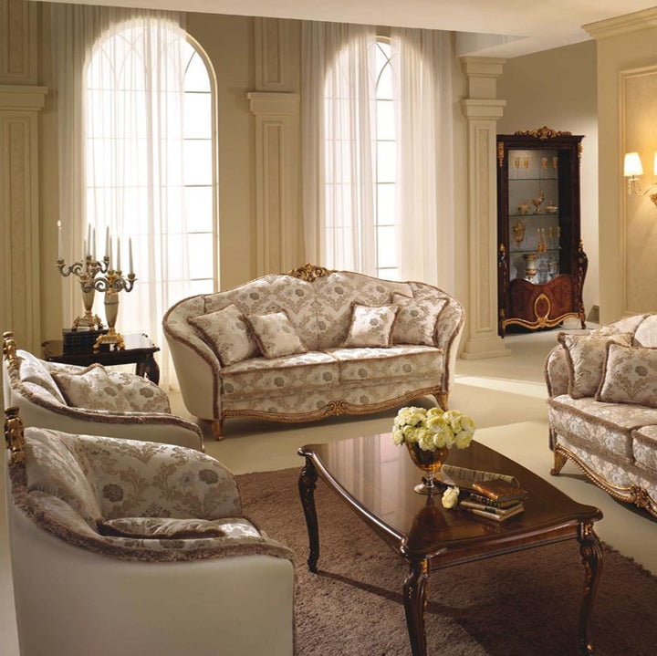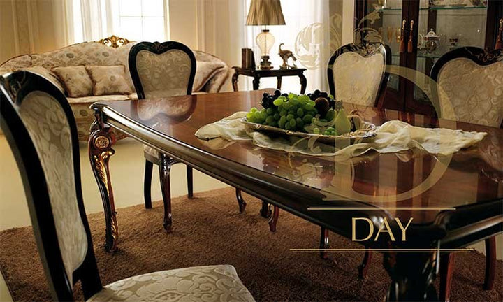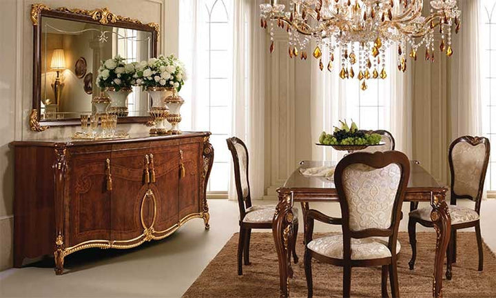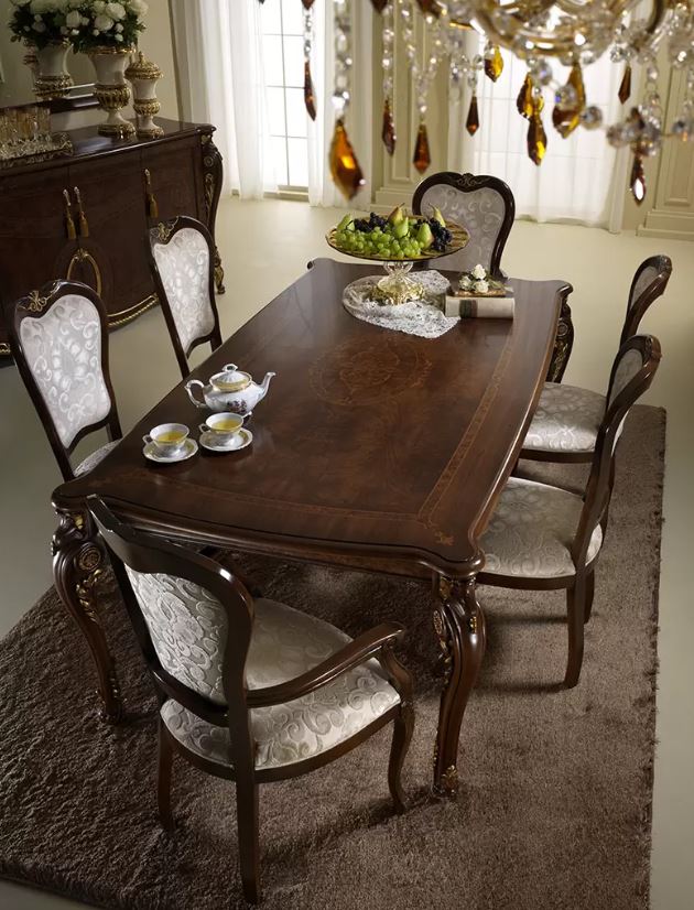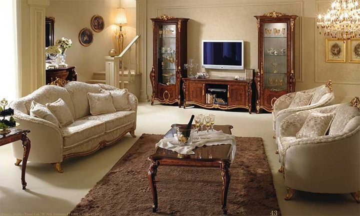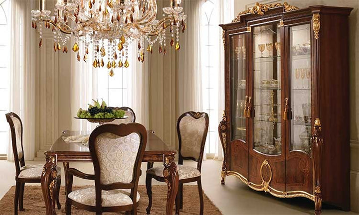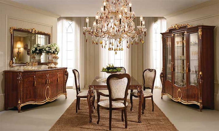 Dining table rectangular extendable standard, Dining table rectangular extendable Maxi, Dining table rectangular fixed, Display cabinet 3 doors, Display cabinet 2 doors, Display case 1 door, Chest of drawers 4 doors, Chest of drawers 2 doors, Large mirror, Mirror, TV cabinet, Chair without armrest, Chair with armrest, Coffee table, Side table, TV set, Set Complete, 2-seater |