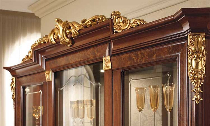 - **Display cabinet and sideboard**: The surfaces are finished with screen printing, the glass is cut and decorated with gold leaf, creating a harmonious and impressive composition.