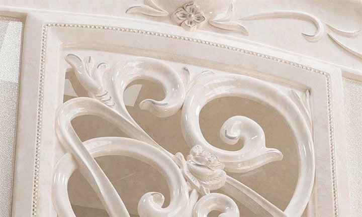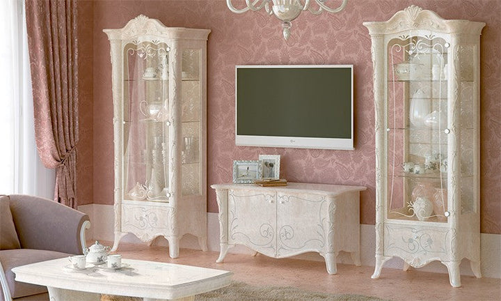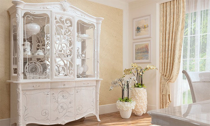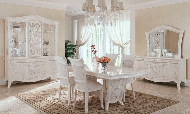 Set Complete, Dining table rectangular fixed, Chair without armrest fabric, Chair with armrest, Display cabinet 3 doors, Display cabinet 2 doors, Display case 1 door, Chest of drawers 3 doors, Chest of drawers 2 doors, Small mirror, Large mirror, TV cabinet 2 doors, Corner showcase, Coffee table |