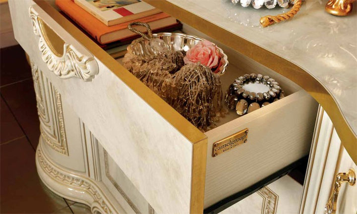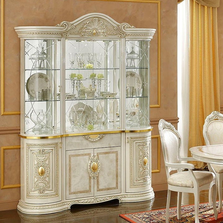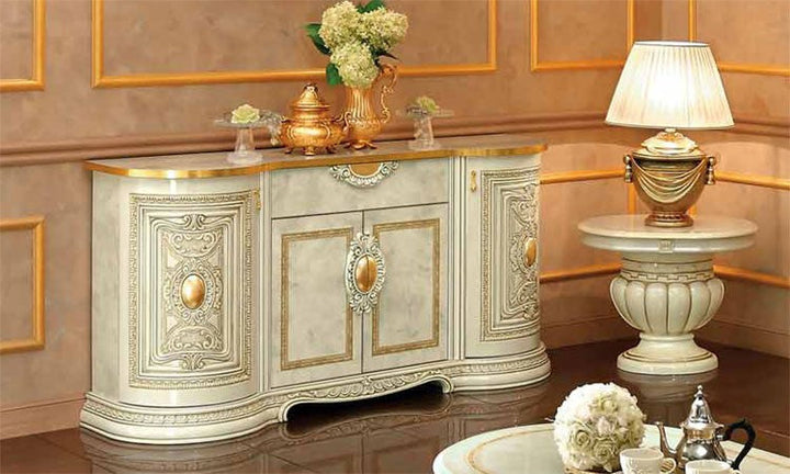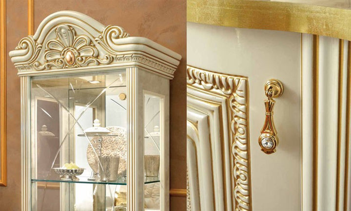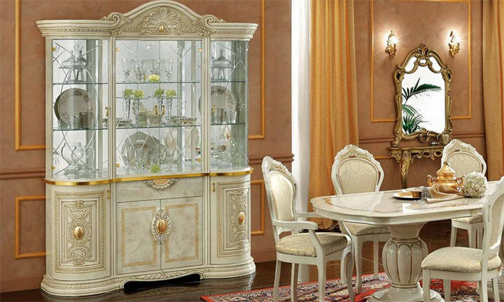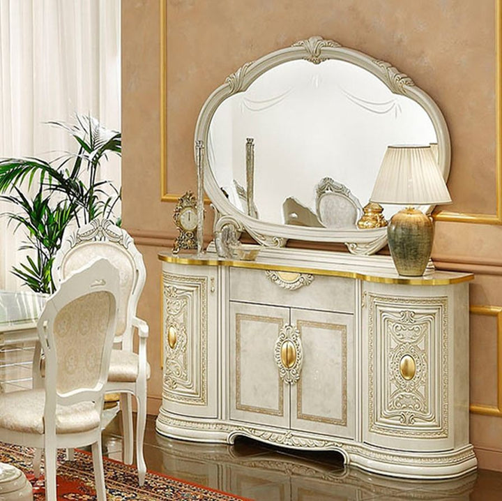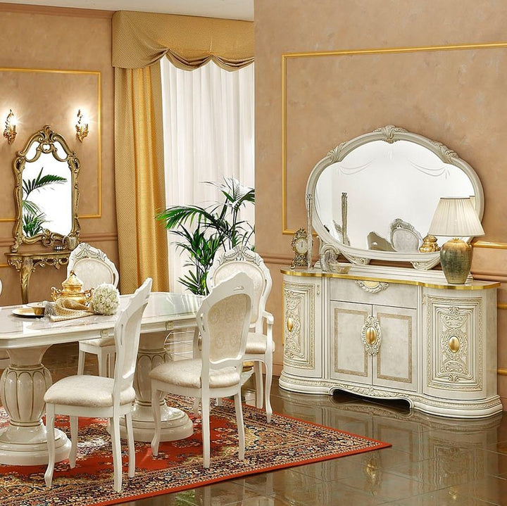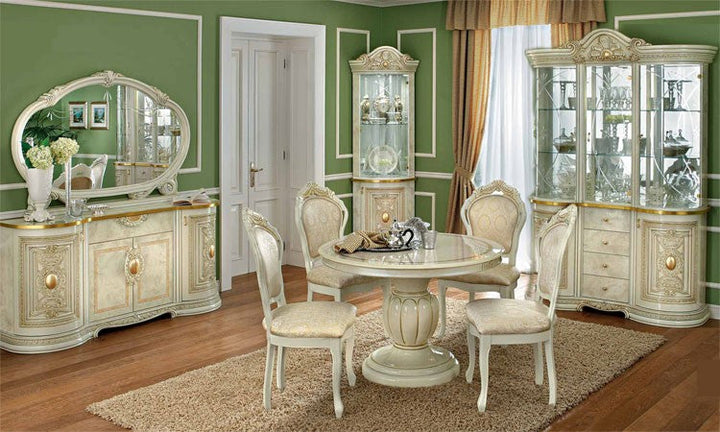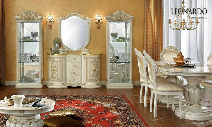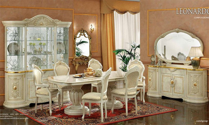 Dining room complete, Round extendable dining table, Oval extendable dining table, Large mirror, Small mirror, Display cabinet 4 doors, Display cabinet 3 doors, Display case 1 door, Display cabinet 2 doors, Corner showcase, Chest of drawers 4 doors, Chest of drawers 3 doors, Corner chest of drawers, Chair with armrest, Chair without armrest, TV cabinet Maxi, Coffee table, Lamp table |