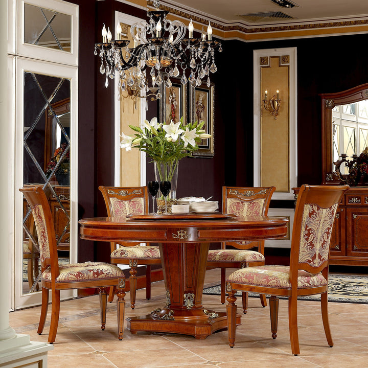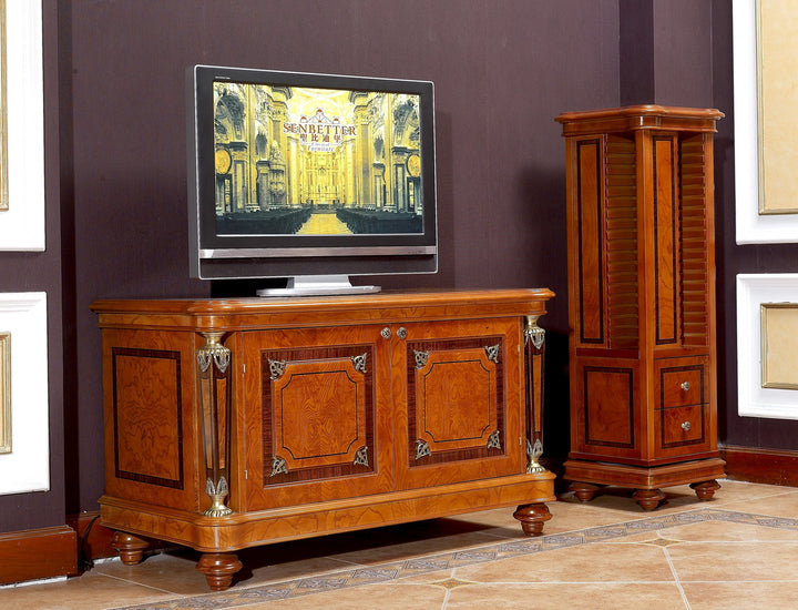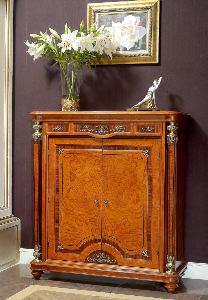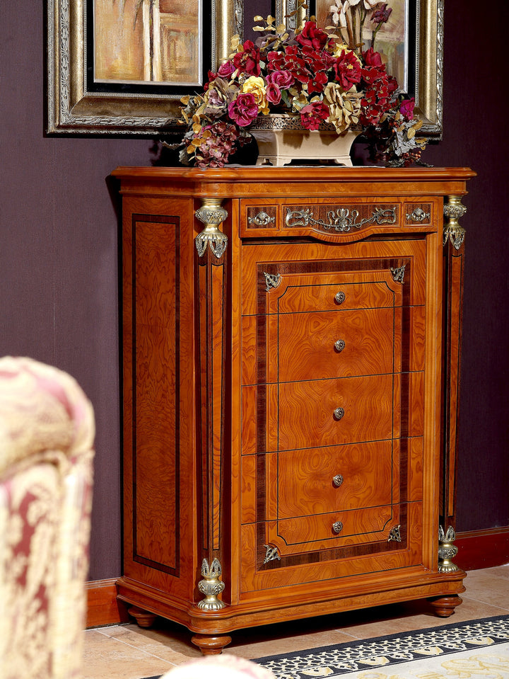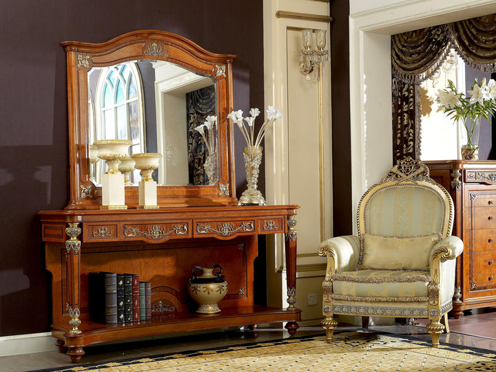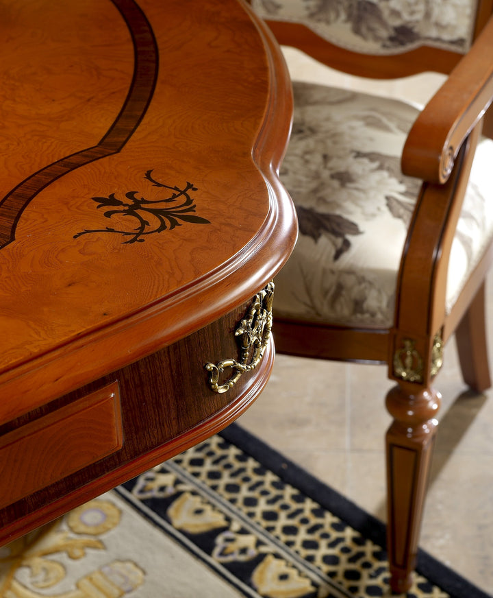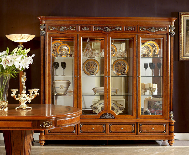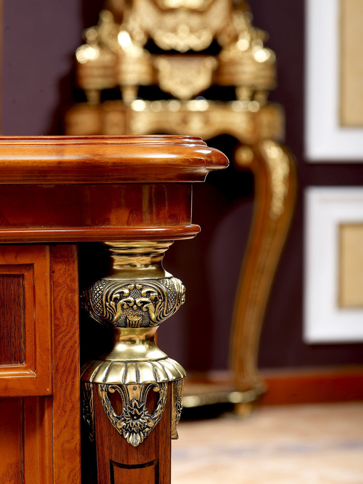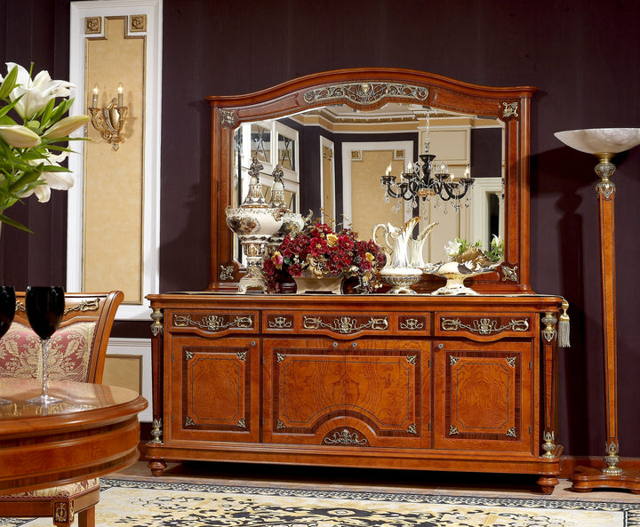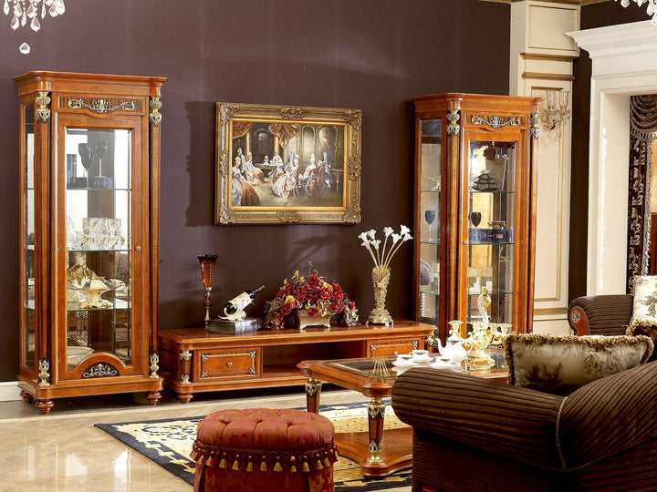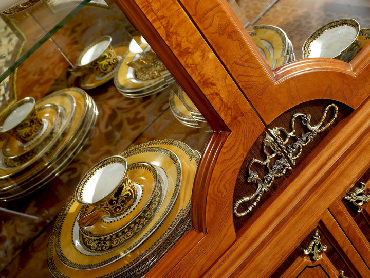 The "Lombardy" series was designed by us in the classic Italian style, together with the best Italian cabinet makers. We distribute the series exclusively throughout Europe and it is very popular. The classic warm cherry tone, together with subtle golden applications, create a unique and exclusive ambience. Exclusivity that is affordable, you benefit from the low prices through our own production and distribution. We are happy to accommodate special requests. All furniture in this series is made exclusively from the best materials and is made of solid wood. We also offer study rooms, bars, bedrooms and sofa sets from this series. Please be sure to let our staff create an individual offer for you and enjoy the moment of Italian quality of life.