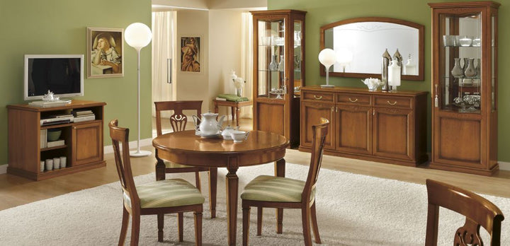 Dining table oval, Dining Table Rectangular, Round dining table, Chair without backrest, Chair with backrest, Display cabinet 3 doors, Display cabinet 2 doors, Display case 1 door, Corner showcase, Chest of drawers 3 doors, TV Cabinet Maxi, TV Cabinet Mini, Mirror Large, Mirror Small, Coffee table, Side table, Set Price |