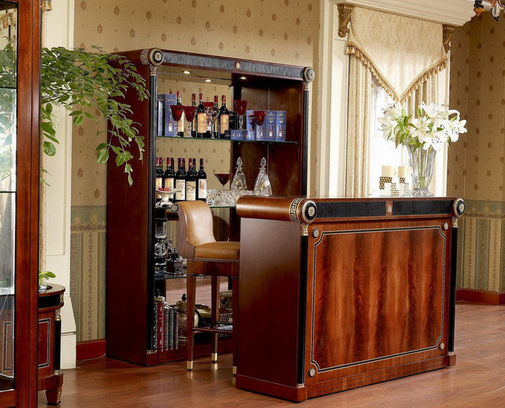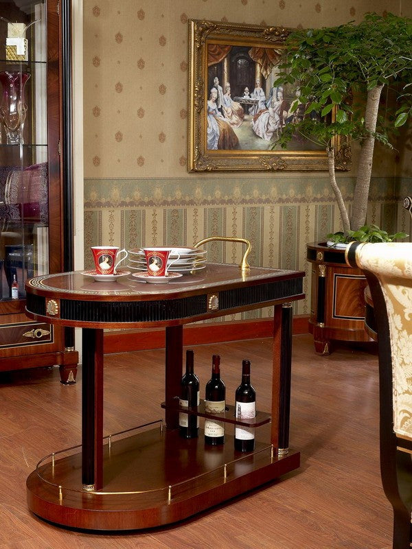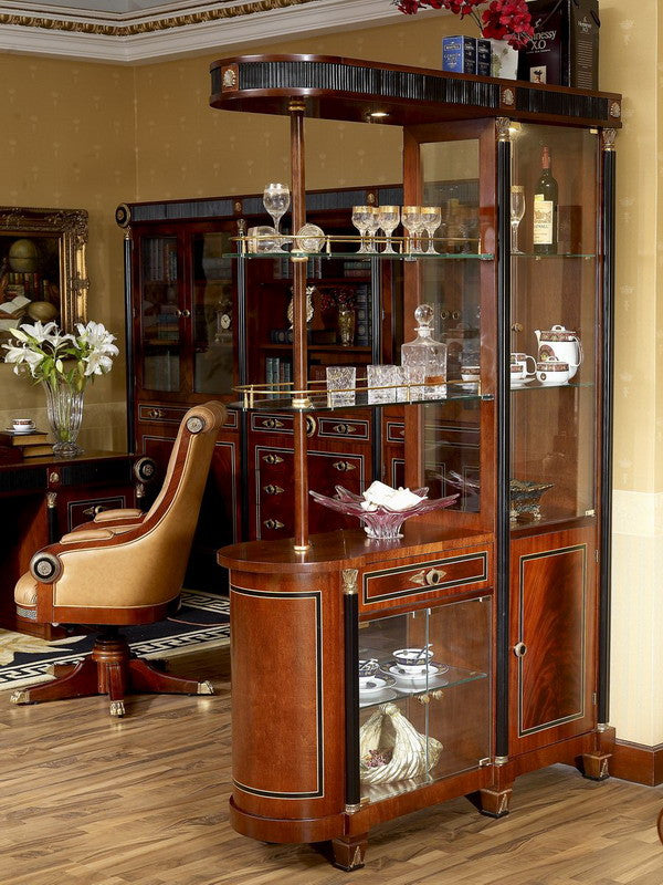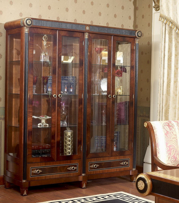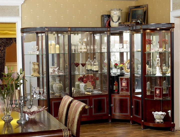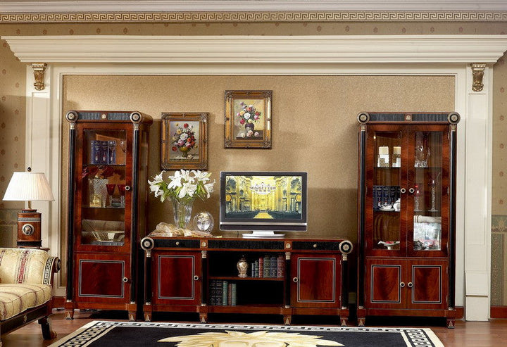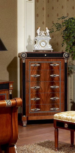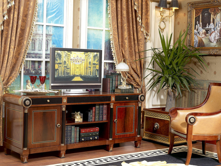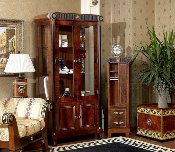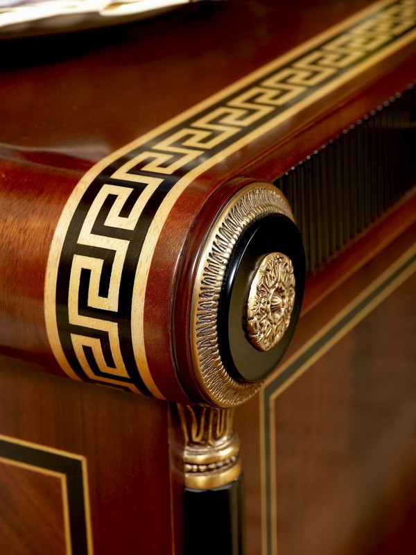 The Piemont series is produced exclusively for us. We designed the design with the best cabinet makers in Italy and have all the items in the series made by hand. We have managed to offer this exclusive series at an astonishingly low price that would otherwise not be possible. The shapes are classic and adapt to all circumstances. Colors and decors have been chosen discreetly. It is made entirely of solid wood. The border in the popular meander design in gold and black and the bronze applications are set by hand into the warm, shimmering walnut-colored wood. Creating long-lasting luxury and lasting value were the main focus during development and production. Please let our employees create an individual offer for you at unbeatable prices.