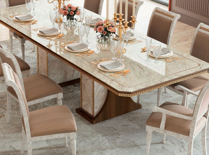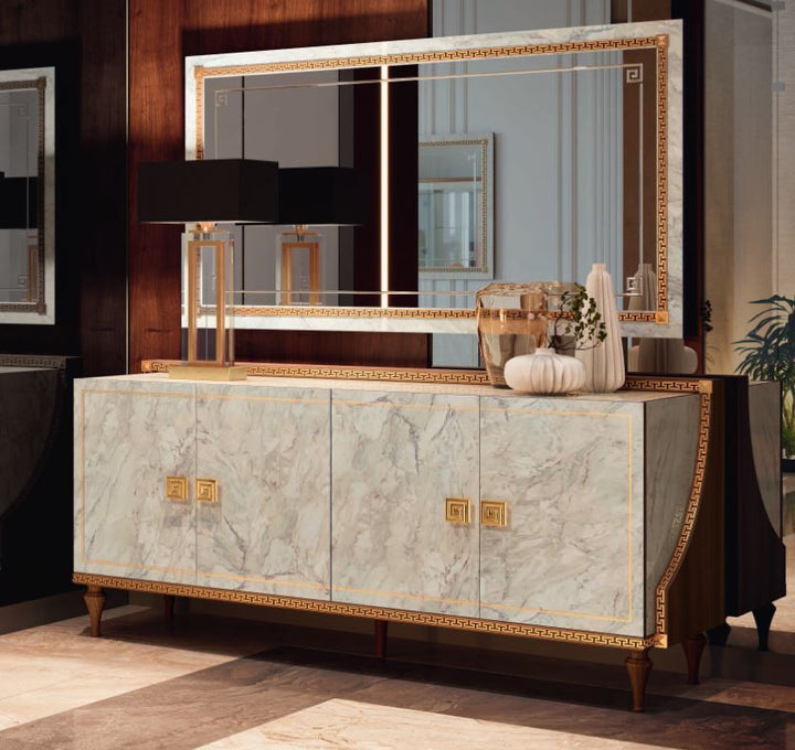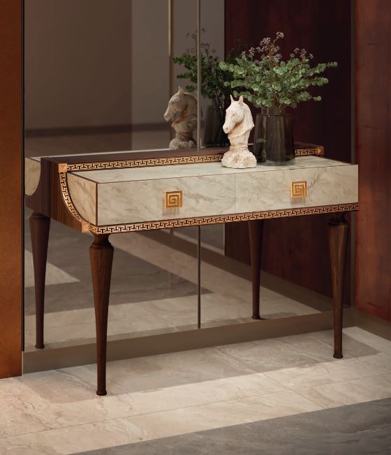 The combination of walnut wood panels and Carrara marble effect gives each piece a timeless charm. The color combination is further enhanced by golden neoclassical accents.