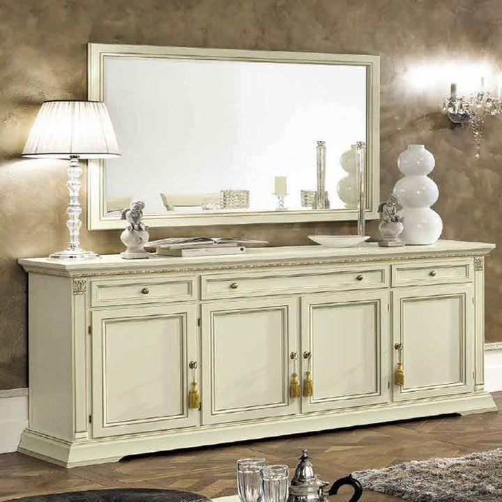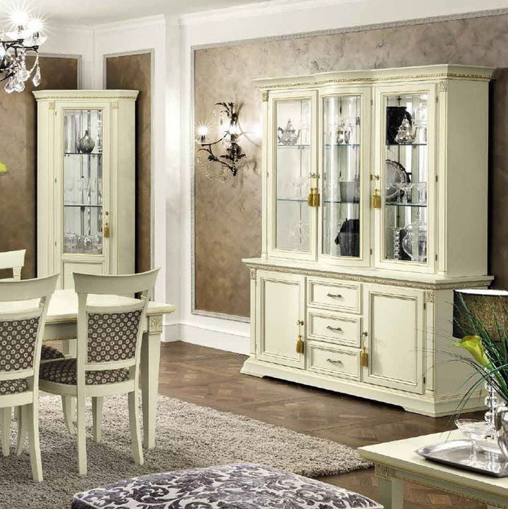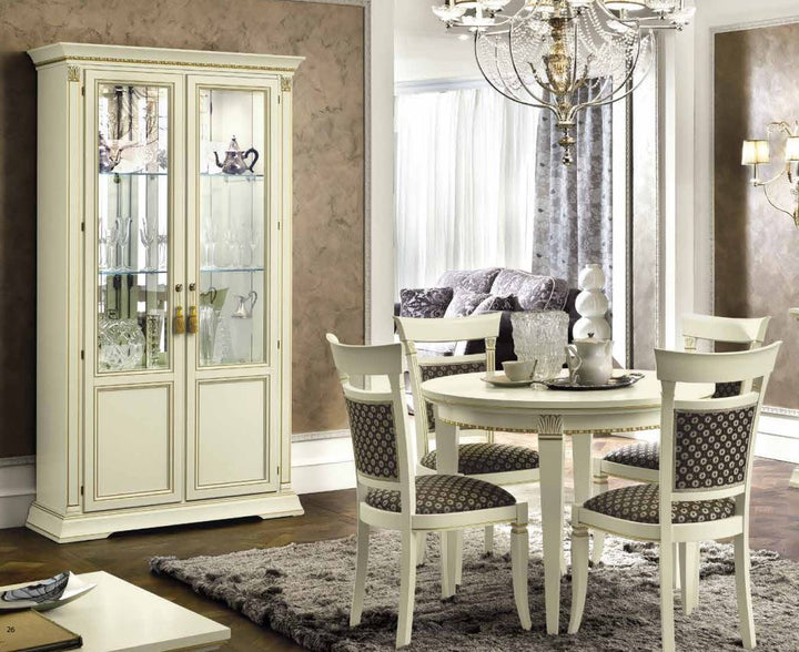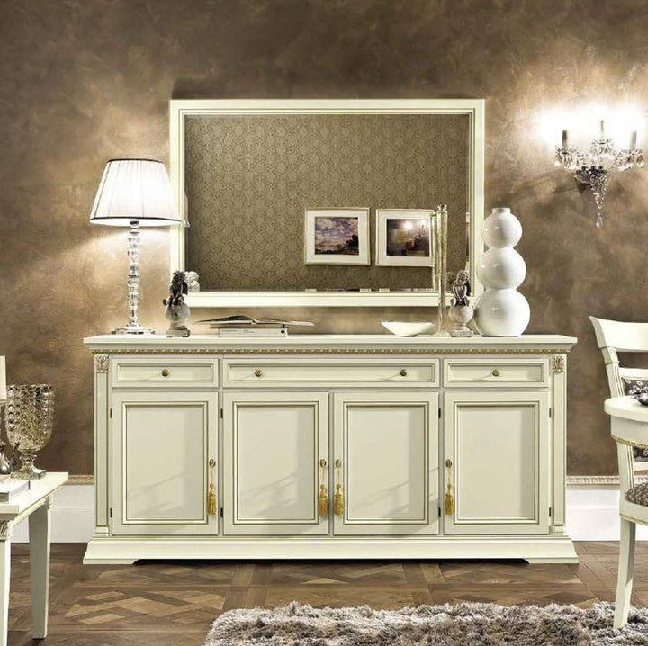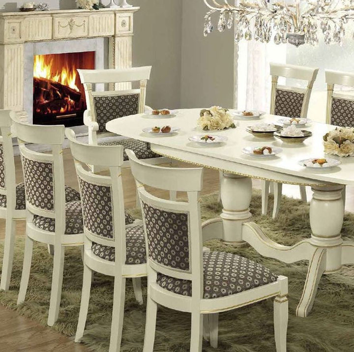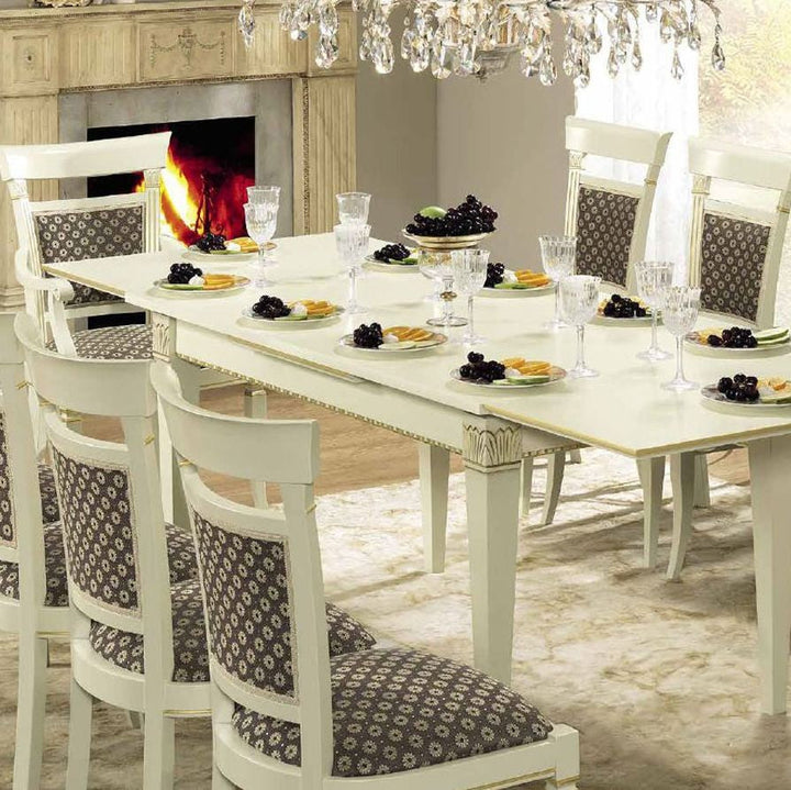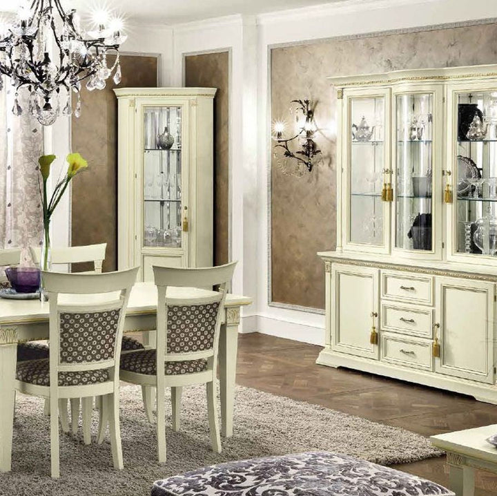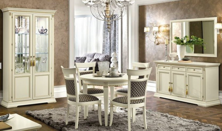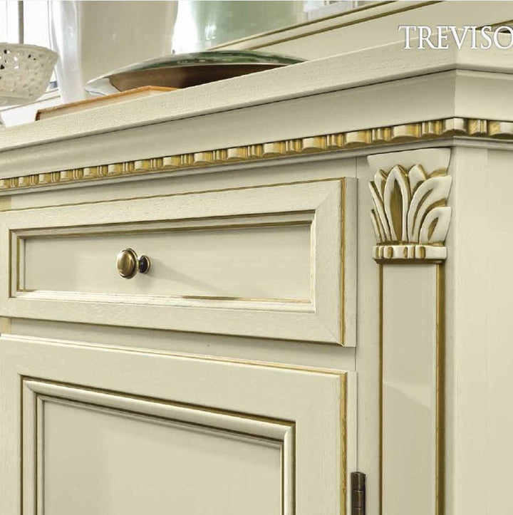 A product of absolute excellence! The golden hand-made decorations in 24 carat gold plating and the engravings and ornaments of the Italian Treviso dining room series give the entire selection an exclusive, Mediterranean flair. The Treviso dining room is made in two colors. You can choose between cherry wood and white ash. Subtle and tasteful classic shapes, decorative details produced according to the highest Italian craftsmanship tradition.