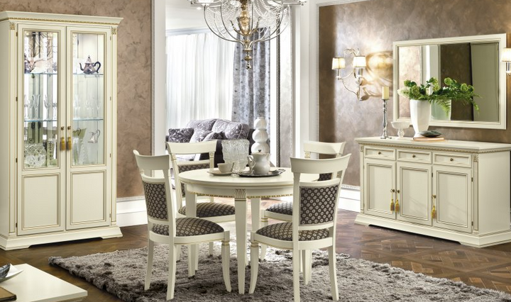 Display cabinet 3 doors, Display cabinet 2 doors, Display case 1 door, Rectangular extendable dining table, Dining table oval, Round extendable dining table, Chair, Chair with armrest, Set Complete, Mirror, Chest of drawers 4 doors, Chest of drawers 2 doors with 3 middle drawers, TV cabinet Maxi, TV cabinet mini, Side table, Coffee table |