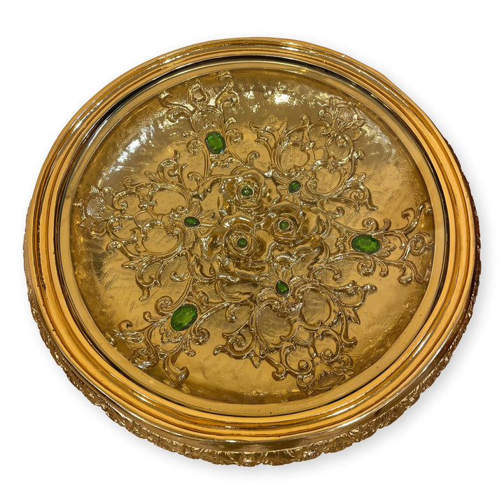 Italian side table in gold, with emerald-like decorative stones. The design is reminiscent of Italian gardens and represents a rose in bloom.