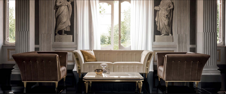 Benefit from our very reasonable prices from our own production; comparable products from other manufacturers are far more expensive than ours. Put together the elements of the suite yourself and choose the fabric combination that suits you best. The final gold plating is applied by hand. The frames are made of solid wood. Only the best foams with a medium seat hardness are used for the fillings. Belt and/or spring cores enable the best seating comfort. Enjoy Italian luxury in an exclusive ambience.