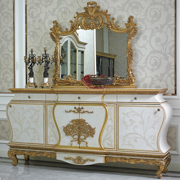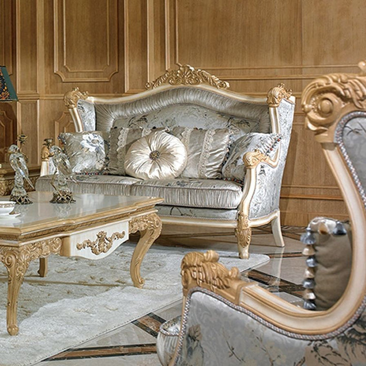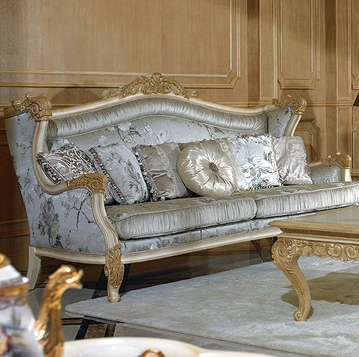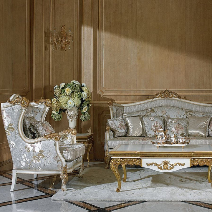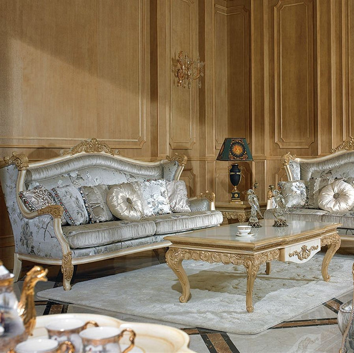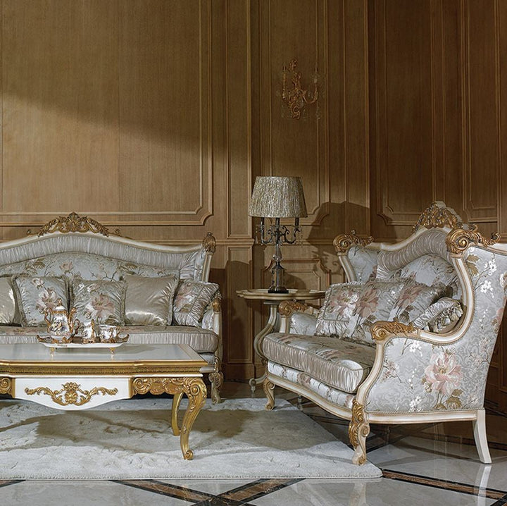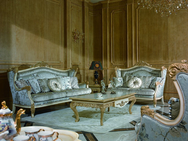 The "Villa D' Este sofa set" series was designed by our Italian designers and meets the highest quality standards. Only the best materials and solid wood are used. The ornaments, borders and applications are handmade and made of bronze.