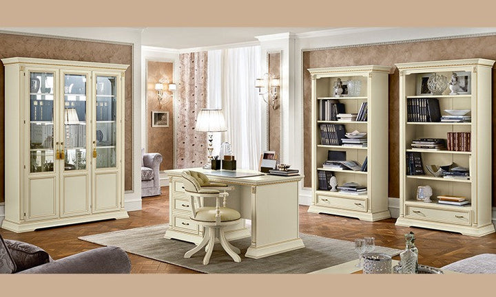 Complete study, Bookcase 2 doors glass, Bookcase 3 doors glass, Open bookshelf, Desk with drawer on the left, Half-chair, Chair without backrest, Chair with backrest |