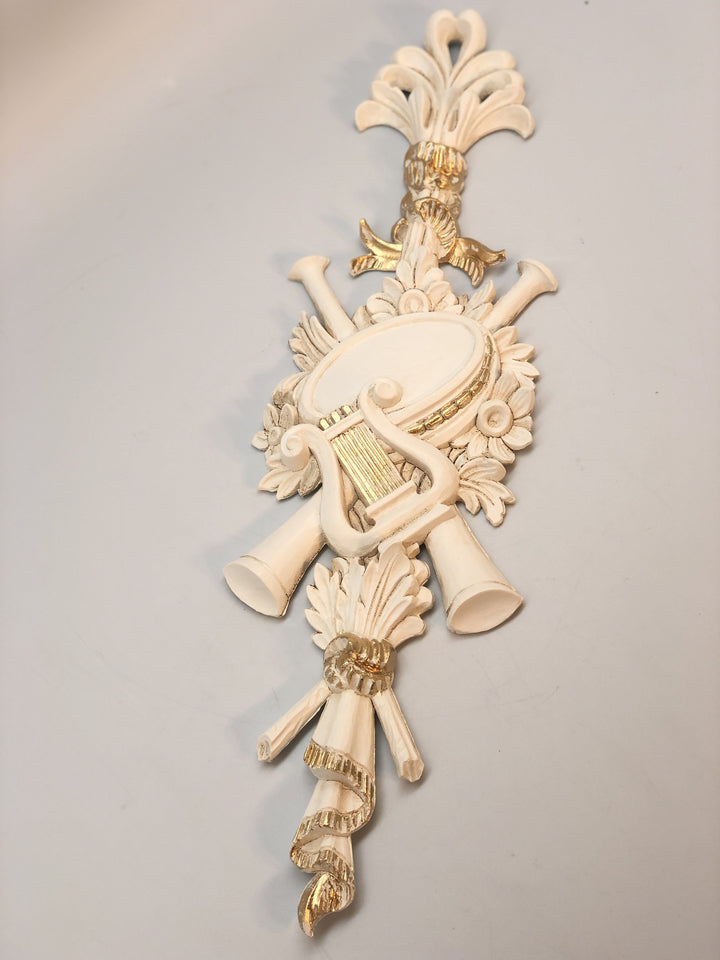 This elegant cream and gold wall decoration brings classic charm and sophistication to your home. The artfully designed decoration shows an arrangement of traditional musical instruments, including a trumpet and a lyre, reminiscent of bygone eras. Finely crafted leaves and floral elements complement the design and give it a luxurious touch.