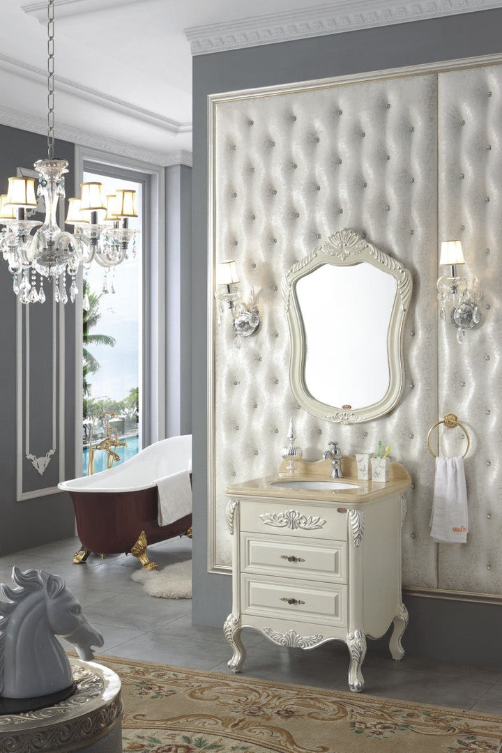 This bathroom cabinet is easily recognizable by its peculiarities, by the originality of the imaginative decorations and by the solid shapes with rounded corners that recall an era of luxury. The structure with marble top and integrated ceramic washbasin is very stable and functional, adaptable to everyday needs. The mirror is made of a wooden frame and crystal mirror glass.